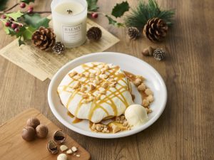 添えたよつ葉の発酵バターアイスとクランブルが味と食感に変化を加え、チーズの濃厚なコクと塩キャラメルのほどよい塩気、マカダミアナッツの香ばしさを存分にお楽しみいただけます。