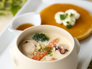 シーフードの旨味とミルクのまろやかさが絶妙に調和し、寒い季節にぴったり。もっちりと焼き上げたパンケーキを添えて、特別感あふれる贅沢な一皿です。