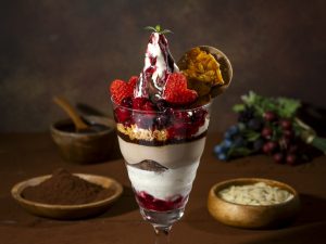 よつ葉北海道十勝産クリームとベルギー産クーベルチュールチョコレートをふんだんにブレンドしたショコラクリームと、ごろっとしたミックスベリーを合わせた限定パフェです。