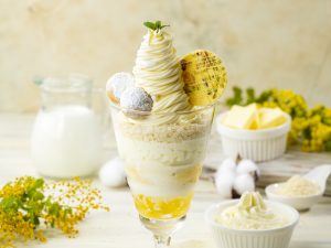 北海道十勝産のよつ葉ソフトクリームにはチーズクリームを巻き上げています。パフェの中は、自家製牛乳プリン・レモンソース・りんごのプレザーブをあわせてさっぱりと仕上げました。
